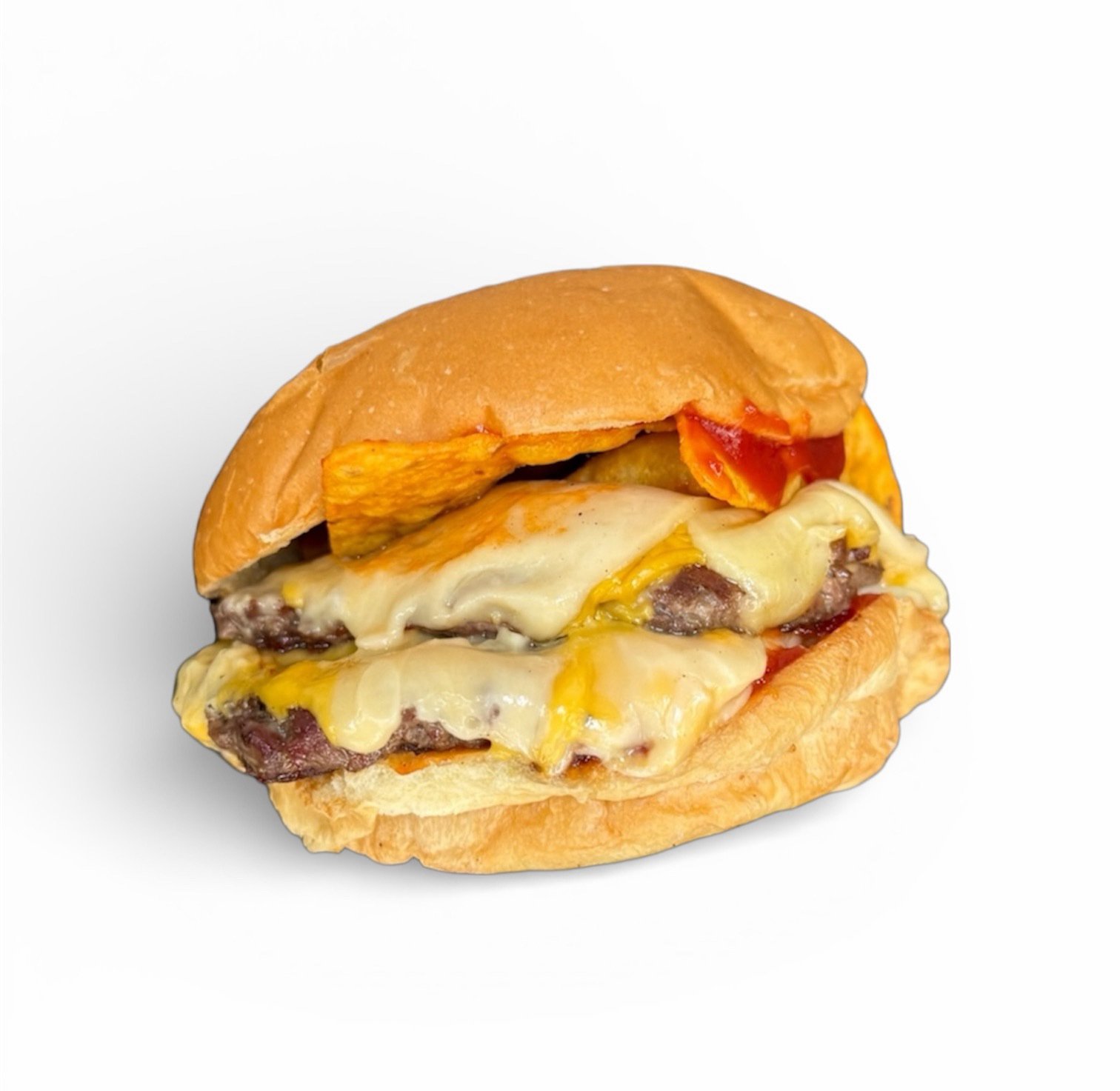 Queso cheddar, azul, tybo y provolone, lluvia de doritos y salsa a base de kétchup
