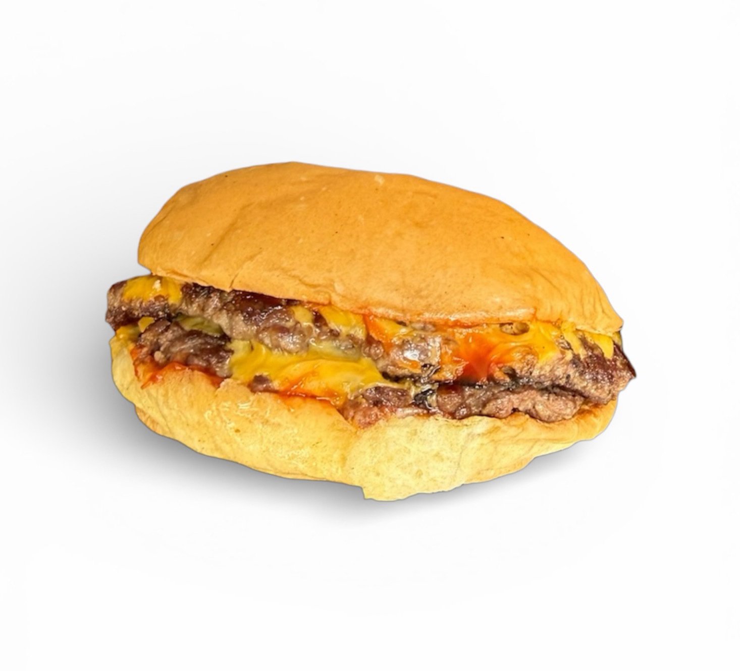 Cheddar, cebolla morada en cubos, salsa a base de kétchup y bacon